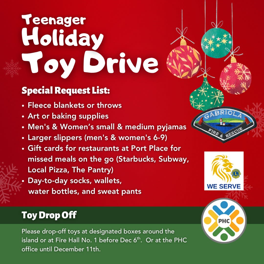 Donate online: Visit CanadaHelps and select the "2025 Toy Drive" to track our success! You’ll receive an instant tax receipt. https://shorturl.at/d1jZq E-transfer: Send donations to food@phcgabriola.org with "toy drive" in the message to help us track donations. Cash donations: Drop off at the North Firehall during office hours.