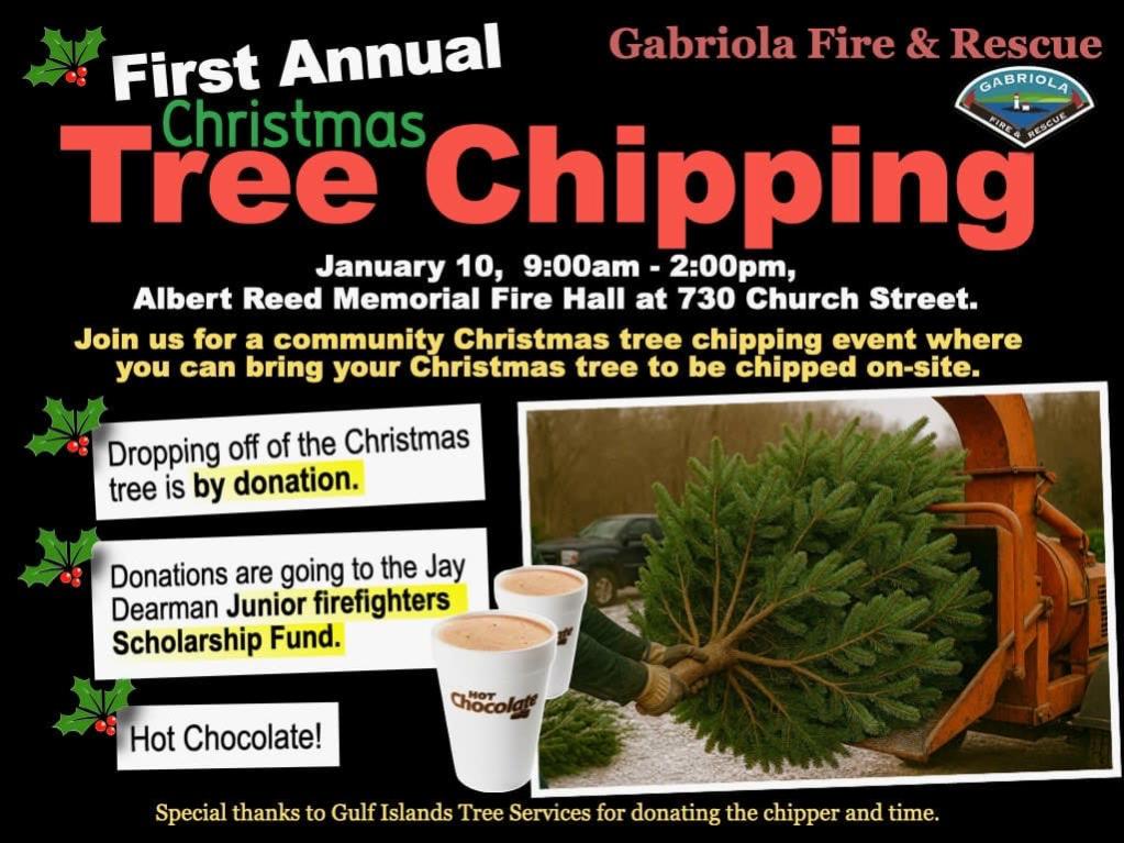 🎄🔥 Save the Date! 🔥🎄 Gabriola Fire Department – Christmas Tree Chipping & FireSmart Event 📅 January 10 Bring your natural Christmas tree to Hall 1 for safe, FREE chipping and learn quick FireSmart tips to help protect your home and property this winter. More details to come! Until then… keep your home safe with these Christmas Tree