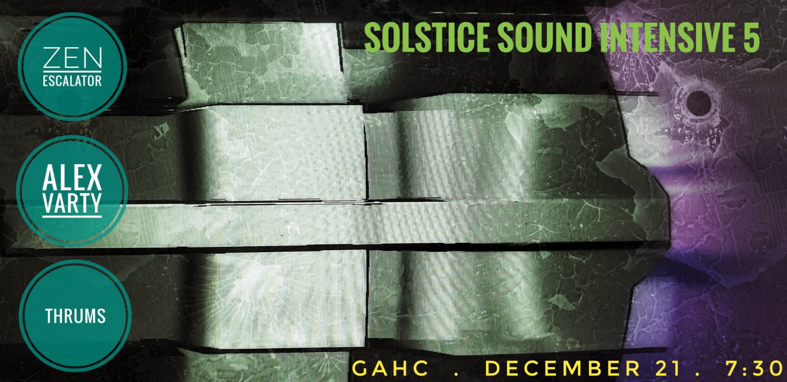 The KHA situation are pleased to present our 5th annual Solstice Sound Intensive. A night to explore the darker side of sound and experimental music while surrounded by entrancing video projections. At the GAHC- Sunday the 21st, from 7:30 until 10ish. This year, we are very pleased to be hosting Zen Escalator, an experimental, improvising electronic due based between Galiano Island and Vancouver. https://zenescalator.bandcamp.com/. Alex Varty will perform an experimental set with surprise instruments, maybe heavy on the ring modulator. Thrums will dive deep into the joy of the darkest night, and the implied return of light on the other side. We'll be spinning the blackest wool yet- a blend of Icelandic, Jacob (the most metal of the sheep) and Welsh Black Mountain. We'll make noise with noise.