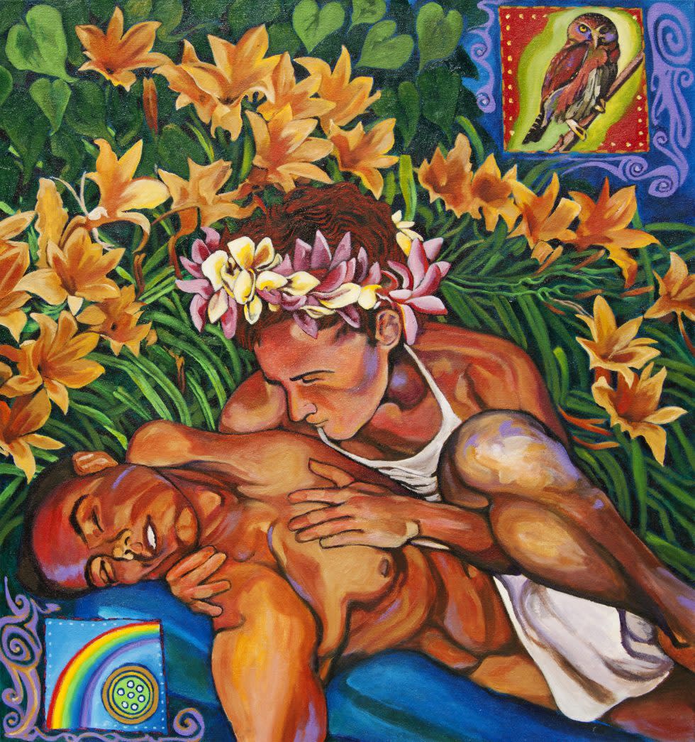 Acrylic paintings, each one a prismatic expression of humanity, the times, the natural world, and hints of old culture-making Big Stories.