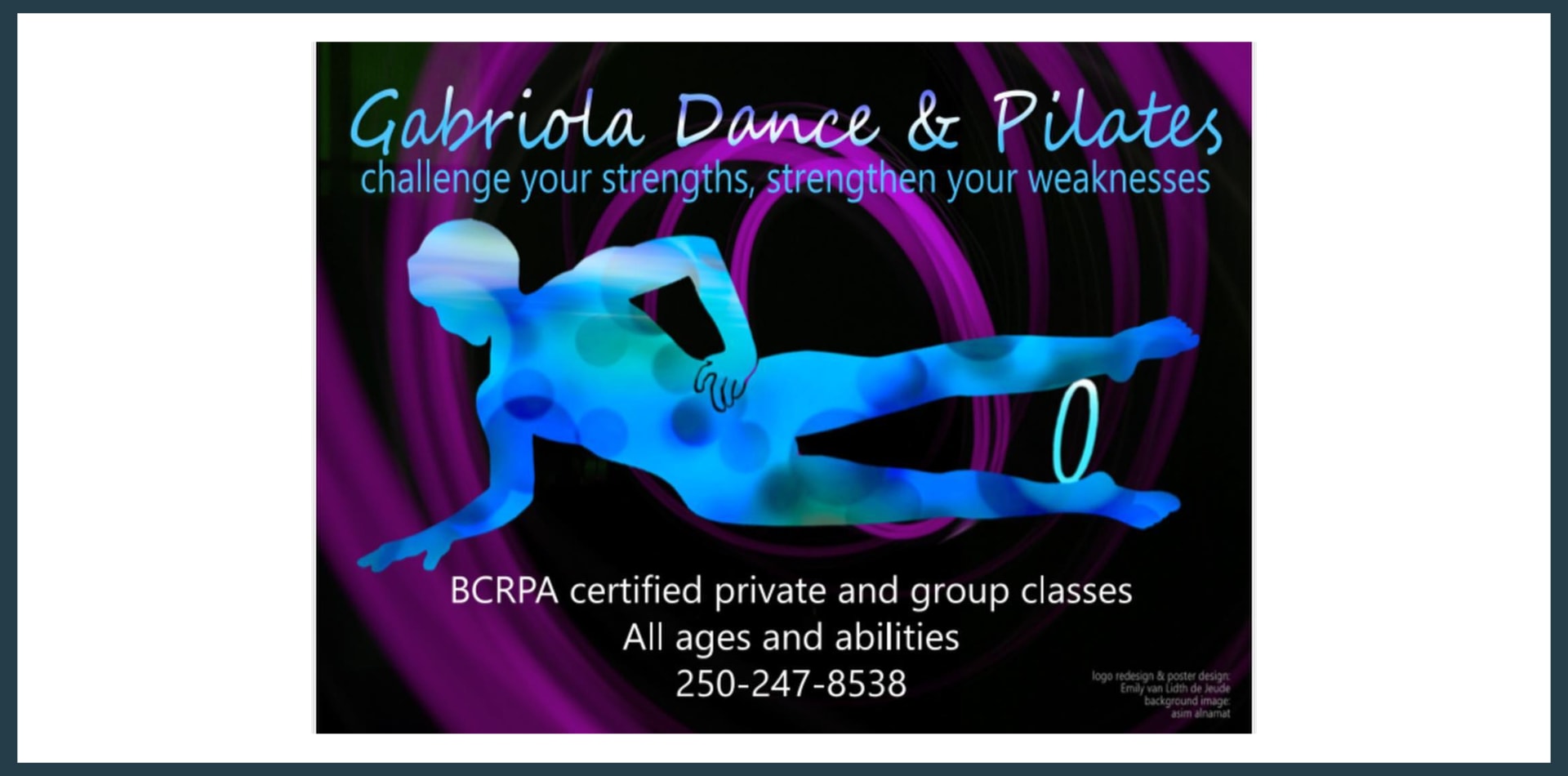 We offer a full service fitness and dance class program for all ages and abilities. Please visit fb page Gabriola Pilates and Dance or call 247-8538 for more info.